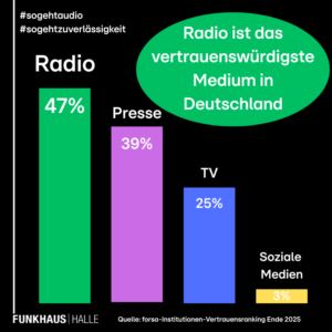 Im aktuellen Forsa-Institutionen-Vertrauensranking belegt das Radio Platz eins und ist damit das Medium in das die Deutschen das meiste Vertrauen haben.